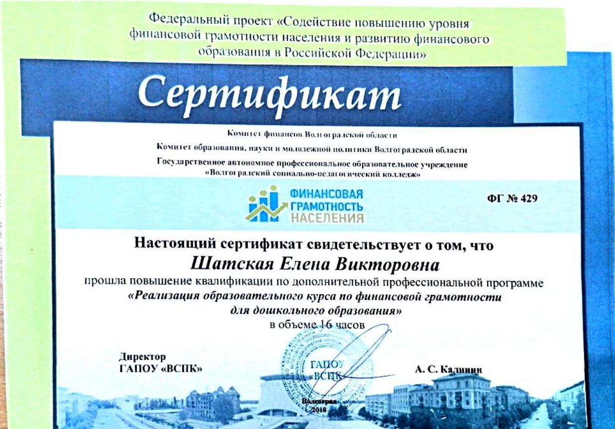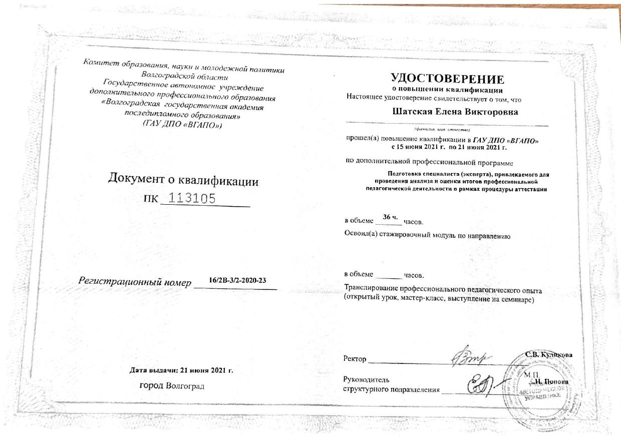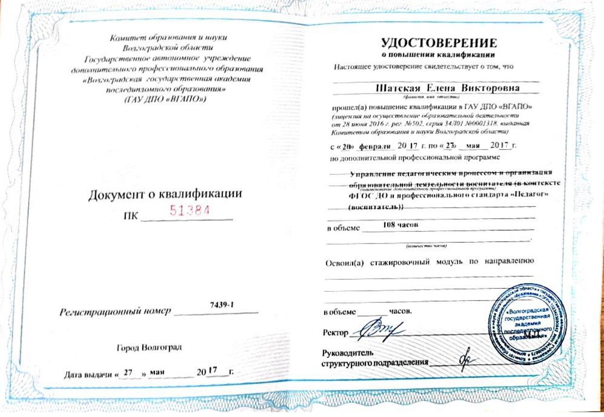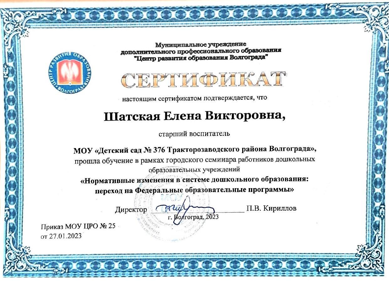 1.ООО «Центр инновационного воспитания и образования» - «Обеспечение СП 2.4.3648-20 в образовательных организациях», 2021г. 2.ООО «Центр инновационного воспитания и образования» - «Профилактика вирусных инфекций, в том числе COVID-19», 2021г. 3.ООО «Центр инновационного воспитания и образования» - «Основы обеспечения информационной безопасности детей», 2021г | 1. МОУ «ЦРО» - Инклюзивное образование: понятие, принципы, организация работы, 2017г. 2. МОУ «ЦРО» - Первая неотложная помощь, 2017г. 3. ГАУ ДПО "ВГАПО" - Подготовка специалиста (эксперта), привлекаемого для проведения анализа и оценки итогов профессиональной педагогической деятельности в рамках процедуры аттестации, 2021 4. МОУ «ЦРО» - Нормативные изменения в системе дошкольного образования: переход на Федеральные образовательные программы», 2023. 5. МОУ ДПО "ЦРО" - Внедрение ФОП ДО: требования и особенности организации образовательного процесса, 2023г. 6. Педагоги России: «Первая помощь в образовательной организации», 36 часов, 2025г. |