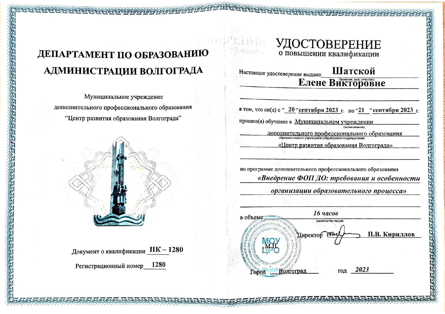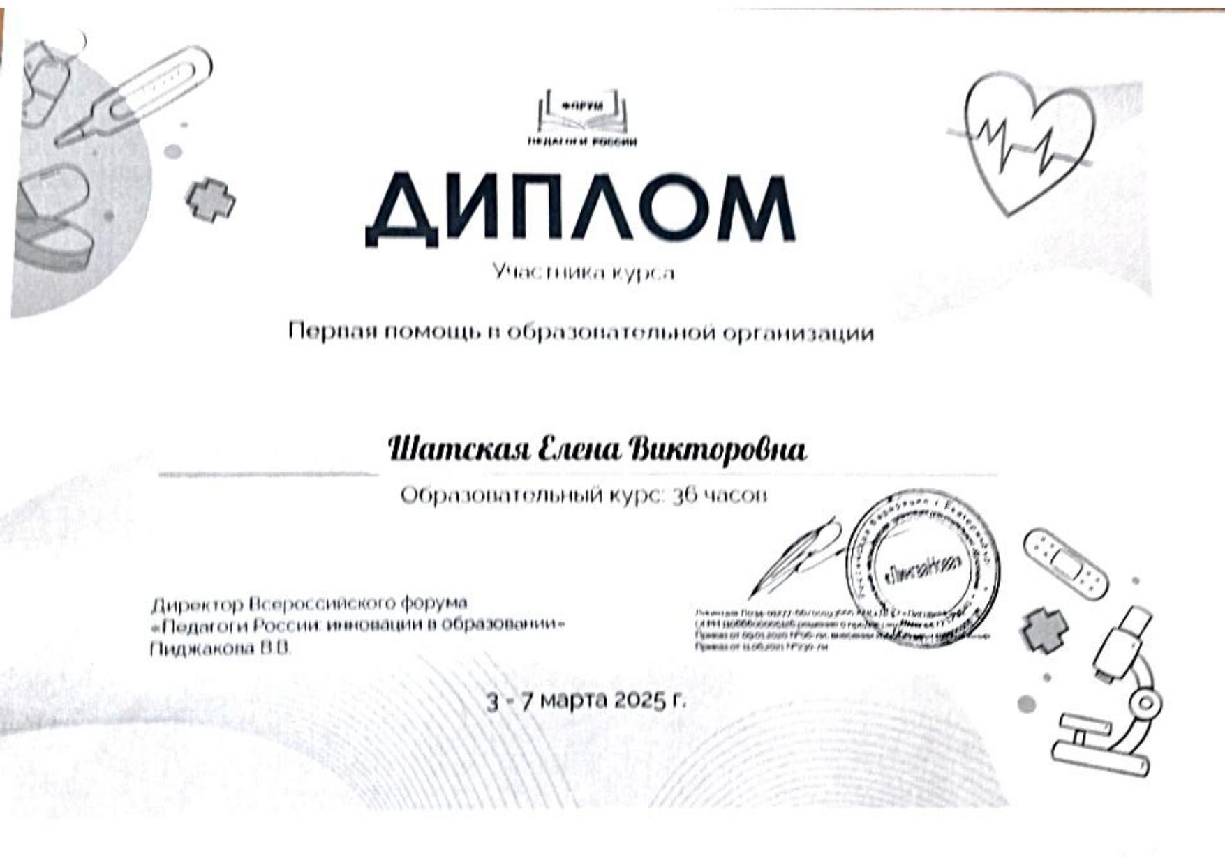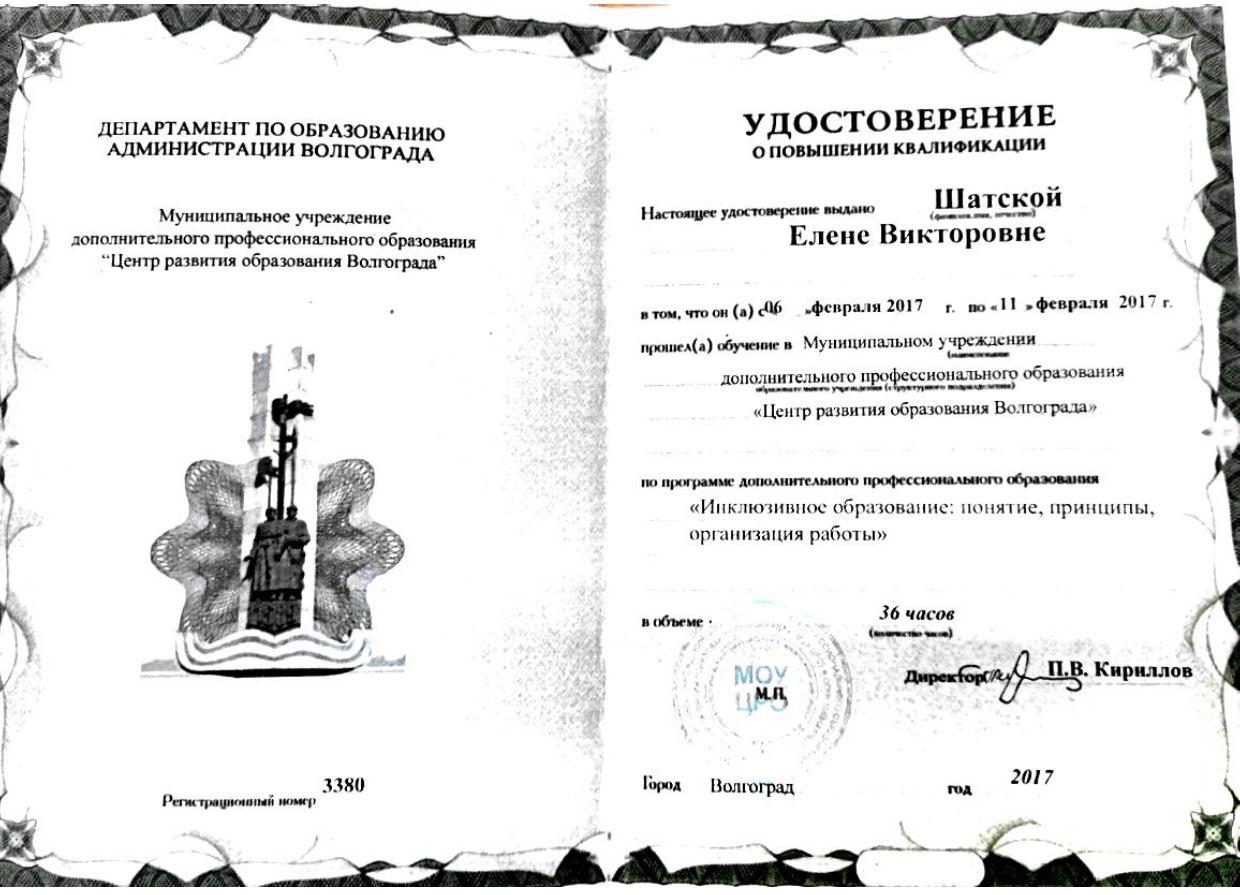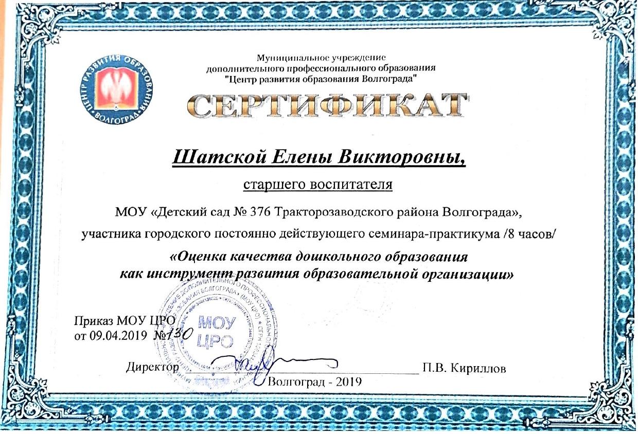 1.ООО «Центр инновационного воспитания и образования» - «Обеспечение СП 2.4.3648-20 в образовательных организациях», 2021г. 2.ООО «Центр инновационного воспитания и образования» - «Профилактика вирусных инфекций, в том числе COVID-19», 2021г. 3.ООО «Центр инновационного воспитания и образования» - «Основы обеспечения информационной безопасности детей», 2021г | 1. МОУ «ЦРО» - Инклюзивное образование: понятие, принципы, организация работы, 2017г. 2. МОУ «ЦРО» - Первая неотложная помощь, 2017г. 3. ГАУ ДПО "ВГАПО" - Подготовка специалиста (эксперта), привлекаемого для проведения анализа и оценки итогов профессиональной педагогической деятельности в рамках процедуры аттестации, 2021 4. МОУ «ЦРО» - Нормативные изменения в системе дошкольного образования: переход на Федеральные образовательные программы», 2023. 5. МОУ ДПО "ЦРО" - Внедрение ФОП ДО: требования и особенности организации образовательного процесса, 2023г. 6. Педагоги России: «Первая помощь в образовательной организации», 36 часов, 2025г. |